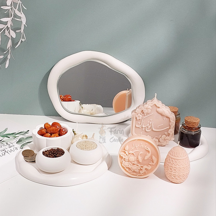 شامل : آینه دکوراتیو دفرمه ، دو عدد سینی گرد دفرمه ، دو عدد بانکه مینی در دار و یک عدد قندان در دار مدل گل می باشد.