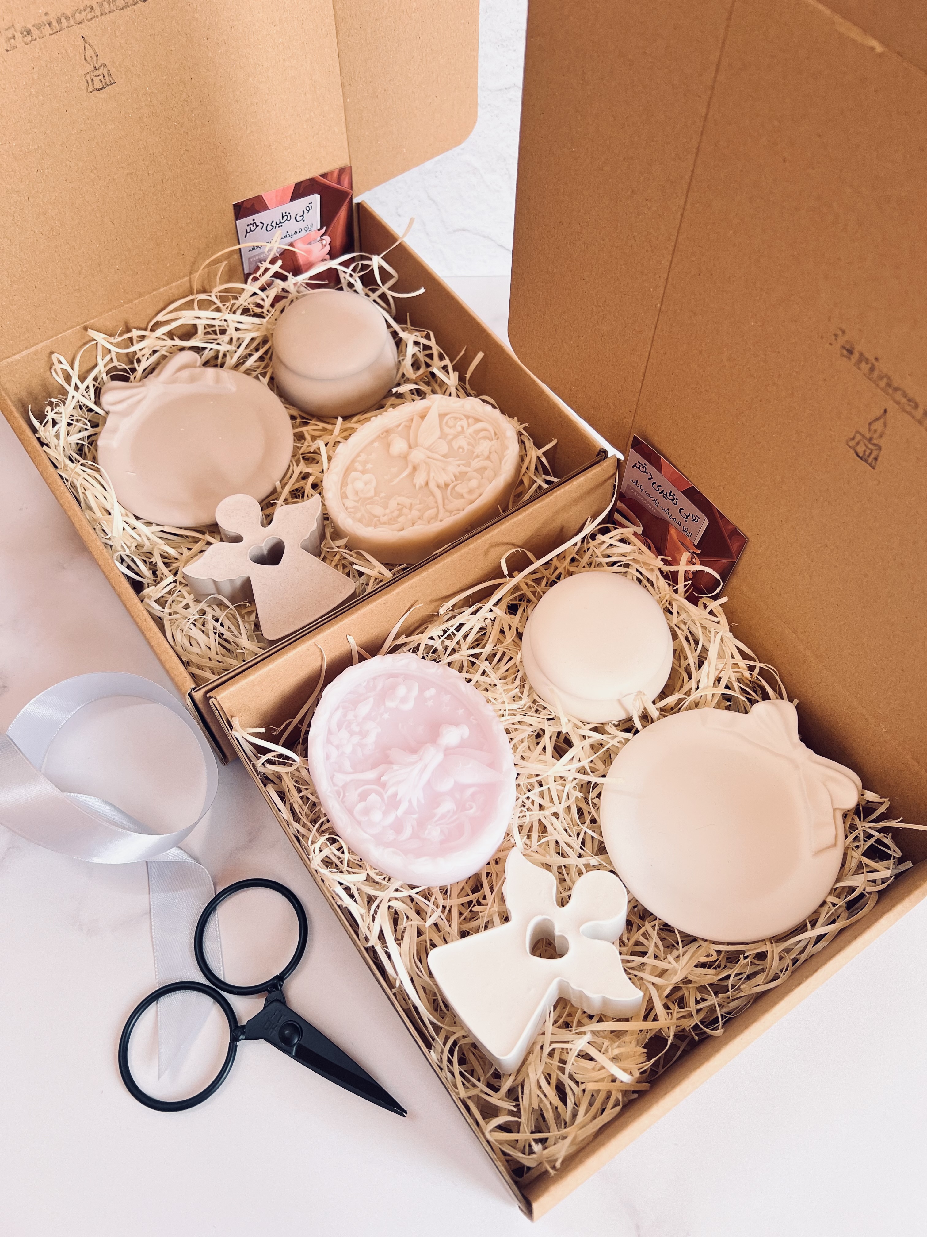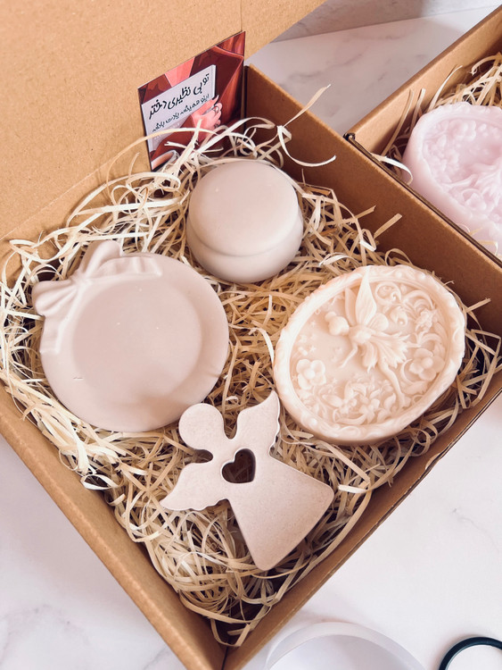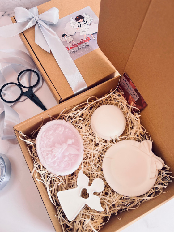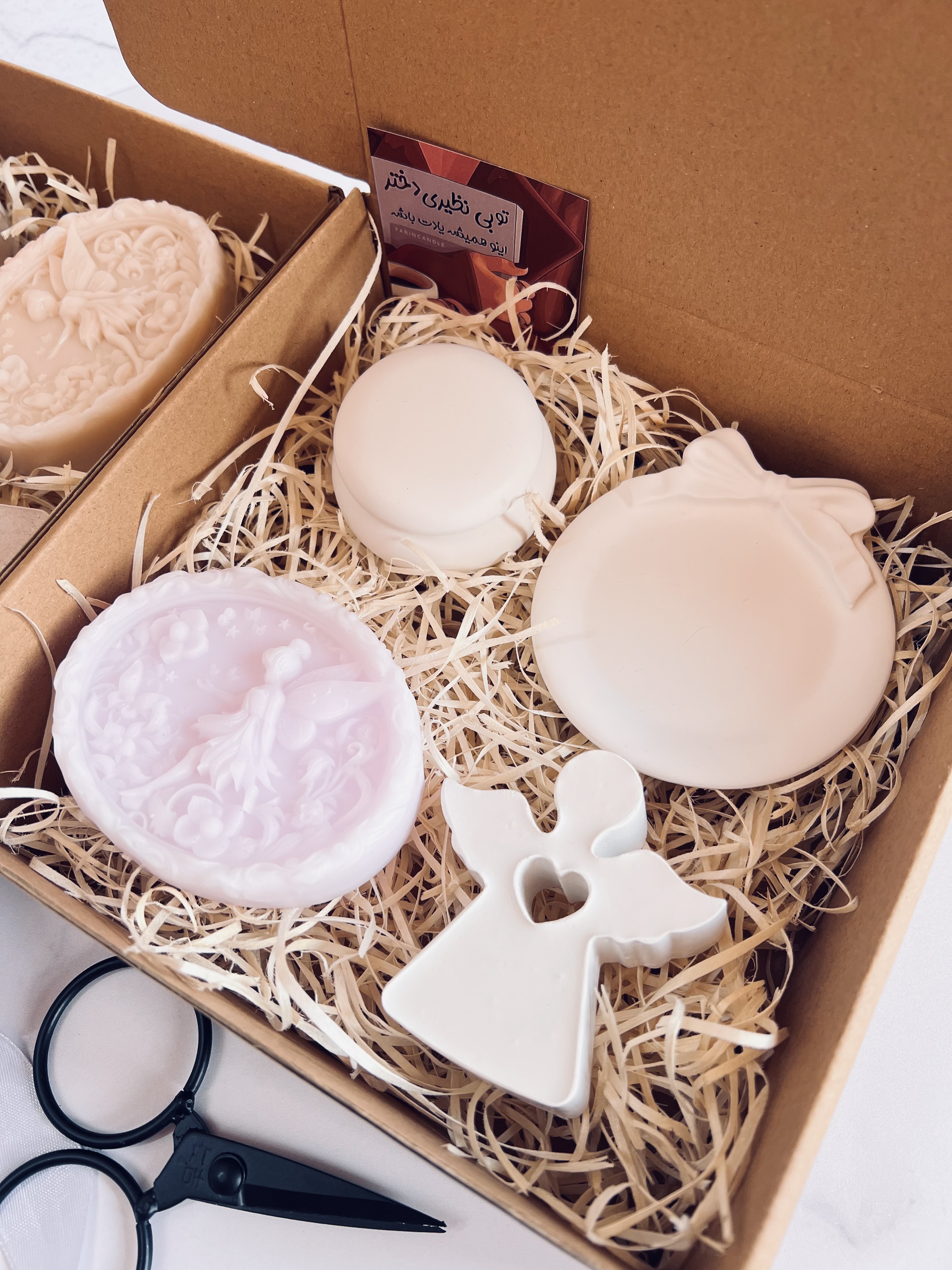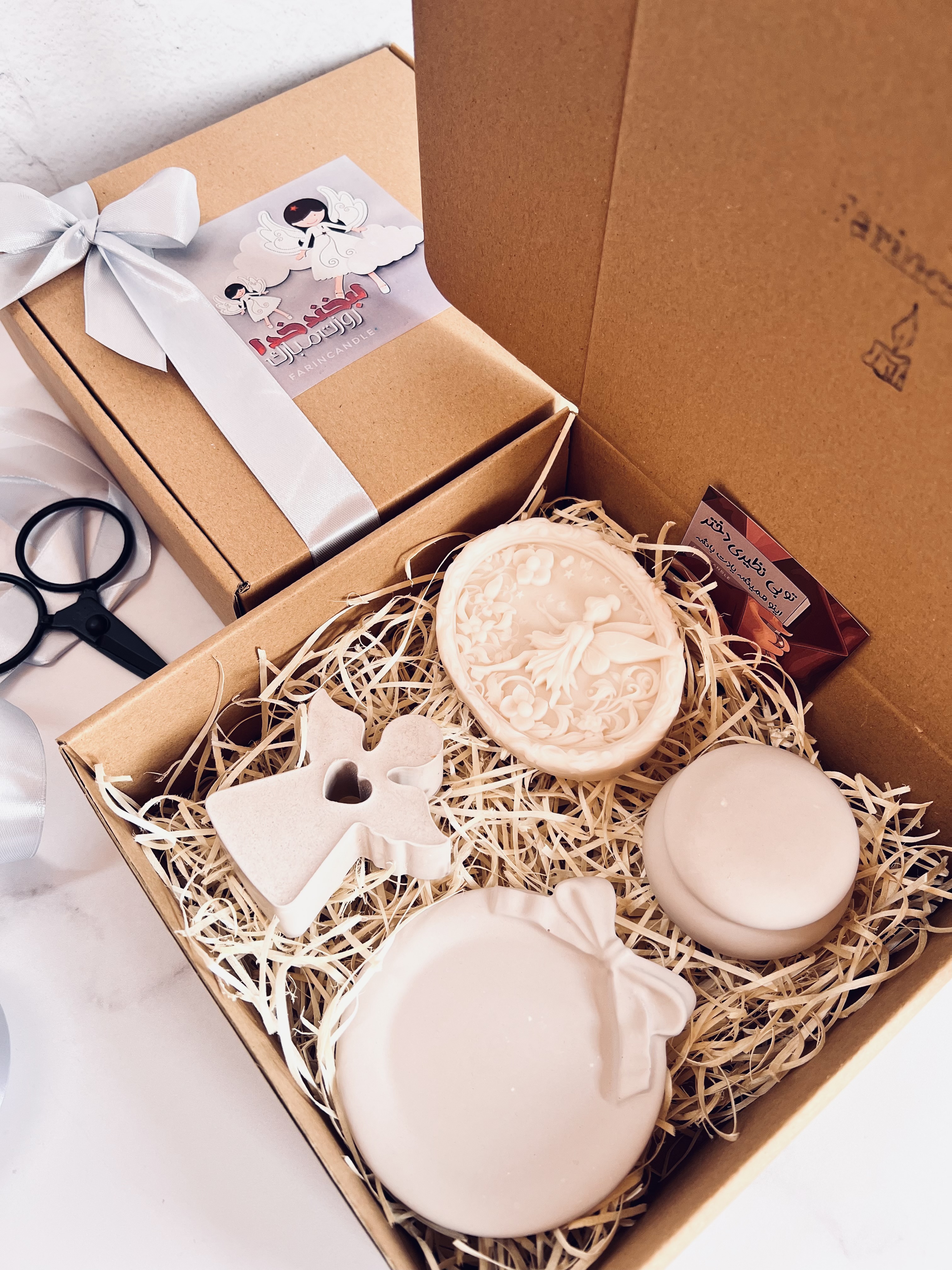 پک هدیه با جعبه کرفت و لیبل تبریک و ربان بوده، داخل جعبه یک شمع فرشته یا آنجل، یک جاجواهری مینیمال، استند پاپیونی و یک مجسمه فرشته می باشد.
