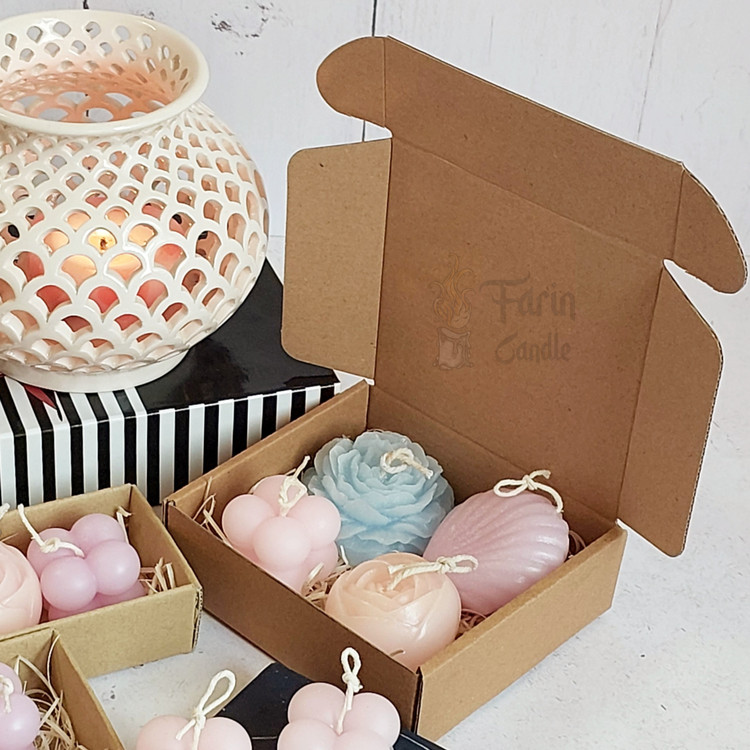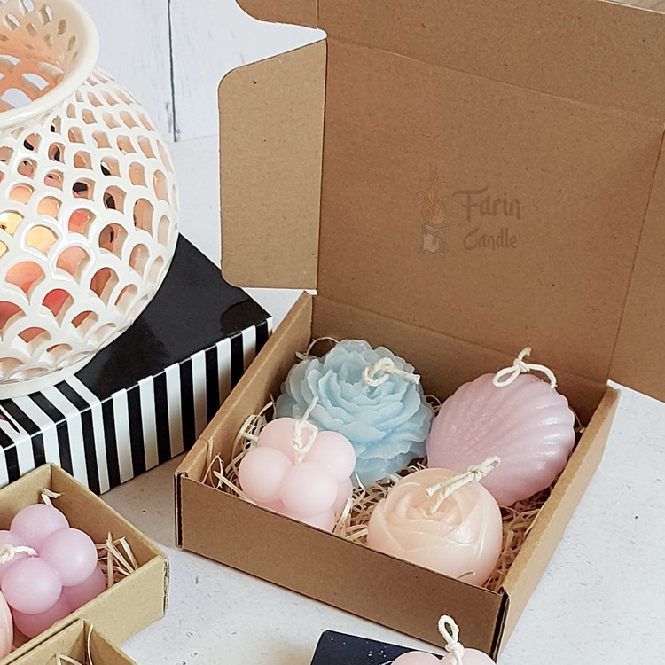 در جعبه ای که در عکس مشخص است چهارعدد شمع:گل پیونی، گل آلاله،روبیک چهرتایی و صدف قرار دارد.