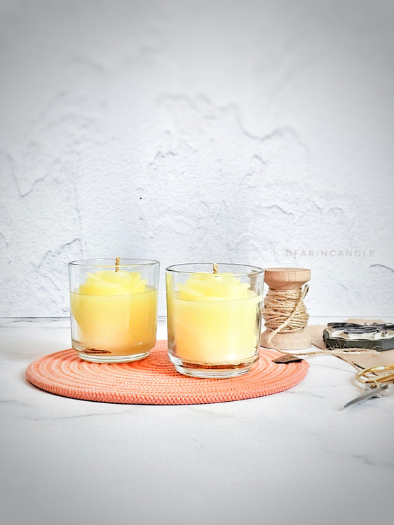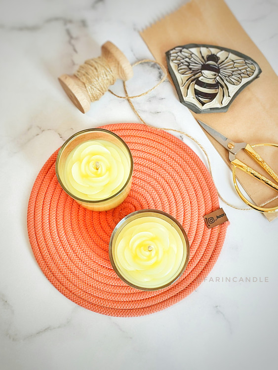 یک گل هم قطر شات روی شمع از جنس موم عسل قرار داده شده است.